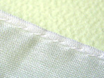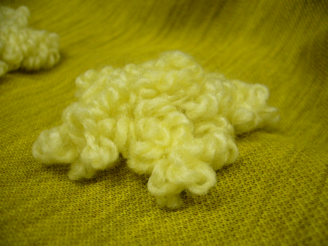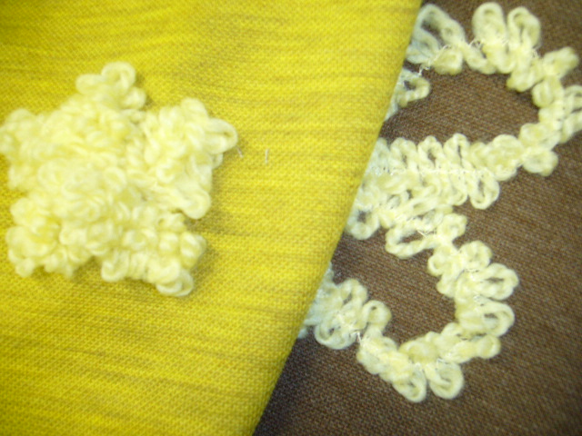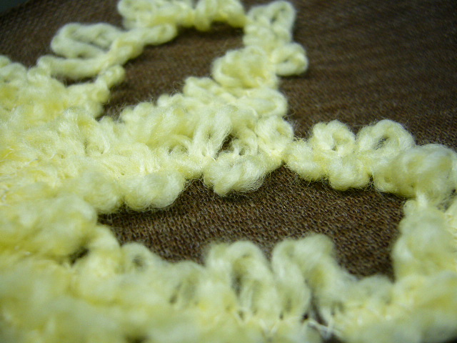 こんなのつくってみました。縫い方と言うよりとめ方と言ったほうがいいですね。これは毛糸を左右に振り、振った毛糸の幅の中心を千鳥で止めたものです。毛糸のフリフリを生かした出来上がりとなっております。普通のテープ付けの千鳥ミシンではなかなか出来ないかもしれません。